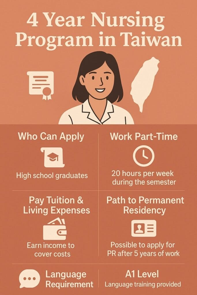 အရေးကြီးအချက်မှာ ဤ Program သည် HCA များအတွက် အလုပ်အကိုင်တိုးတက်စေရန် – Healthcare Assistant မှ Registered Nurse သို့ – တံခါးဖွင့်ပေးပြီး၊ အမြဲတမ်းနေထိုင်ခွင့် (PR – Permanent Residency in Taiwan) မှတဆင့် ရေရှည်တည်ငြိမ်မှုအတွက် တိုက်ရိုက်လမ်းကြောင်းတစ်ခုကို ဖွင့်ပေးနိုင်သည့် လမ်းကြောင်းတစ်ခုဖြစ်ပါသည်။